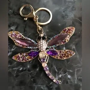 Sparkling dragonfly bag charm/keychain with vibrant purple and gold accents. Perfect for adding a touch of whimsy to your bags or keys.
