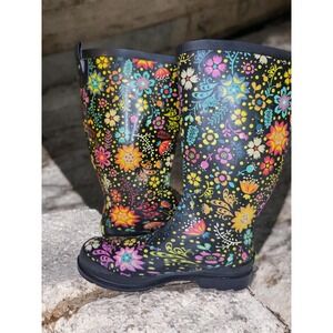 The Western Chief Rubber Rain Boots Galoshes in women's size 7 are perfect for splashing in the rain or playing in the mud. These black boots feature a round toe, pull-on closure, and a low heel height, making them comfortable and practical for all-day wear. Made of waterproof rubber, these boots are slip-resistant and ideal for all seasons. The floral pattern and buckle accents add a touch of style to these Western-themed boots, making them a versatile and fashionable choice for any occasion.