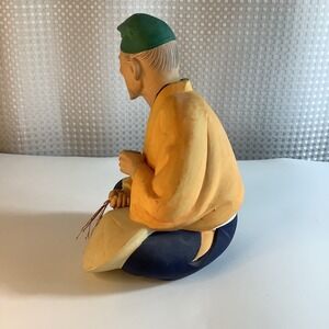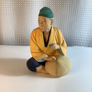 Vintage Hakata Mimasu Doll Japanese Old Man Holding Cup & Conical Hat & Straw in Hand Clay Figurine Hand Painted
