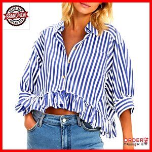 Cropped Striped Button Down Shirt with Ruffle Hem 3/4 Sleeve Blouse