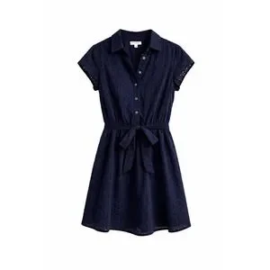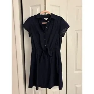 Charming and versatile J.Crew Mercantile eyelet mini dress in classic navy. This lightweight cotton dress is perfect for warm weather, casual outings, brunch, or weekend adventures. It features a crisp collar, button-placket front, and a flattering self-tie waist that defines your silhouette while keeping it relaxed and comfortable.