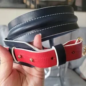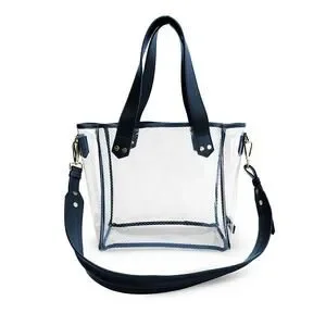 The perfect tote for sporting events at exactly the largest size compliant at U.S. stadiums. Navy Italian leather trim, custom French hardware, and thick PVC perforated for breathability. It won't sweat, warp or lose its structure. Customized w red accents and a longhorn logo.