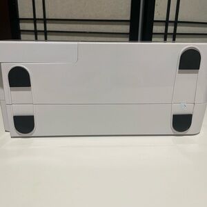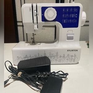 Compact sewing machine with a white and blue design. Includes power adapter