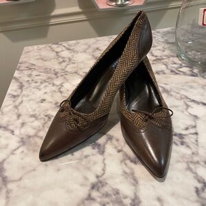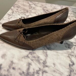 Chic brown heels with herringbone pattern. Features elegant bow detail. Ideal for stylish occasions.
