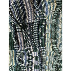 Vintage Tundra Canada Coogi 3D knit sweater from the 1990s in a striking green, blues, and tan colorway. This size L sweater is designed to be oversized with measurements of 28” shoulder to shoulder, 27” armpit to armpit, 18” bottom hem, 24” sleeve length, and 29” length in front (measured from center of top neck to bottom of hem).