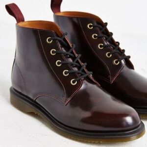 Sleek and sophisticated, the Emmeline 5-eye boot has a low profile and a dignified look - and comes in Arcadia, a classic high-shine rub-off leather with a two-tone effect, that, like all Docs, only gets better with age. The Emmeline is a refined women's boot, yet still bears unmistakable Doc's DNA, like grooved sides and Goodyear-welted and air-cushioned soles.