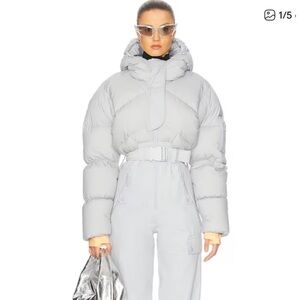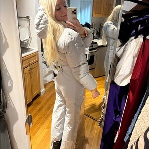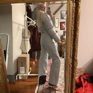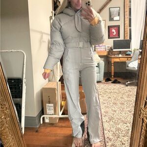 Discover elegance with this sleek gray jumpsuit, perfect for the slopes. Experience comfort and style in one piece. Never been worn. Additional photos showing the many pockets.