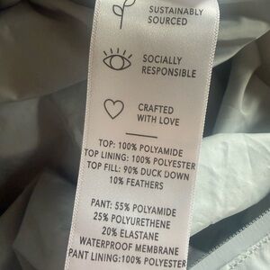 @cashblake - yes, it’s warm! I would say Cordova is the warmest of the fashionable brands of ski suits (more than perfect moment, Goldberg, mackage, etc). The tag says it is polyester lining, which I attached in photos. Really the only flaw is that the size tag fell off, but it’s a small.