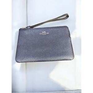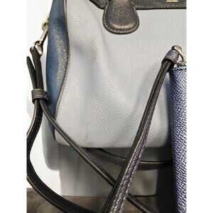 Authentic Coach satchel crafted in pebbled leather featuring a structured silhouette with dual top handles, zip-top closure, and detachable crossbody strap. The design is finished in a refined colorblock palette with polished hardware and a spacious fabric-lined interior. Included is a matching Coach metallic leather wristlet with zip closure and wrist strap, offering a coordinated and versatile set.