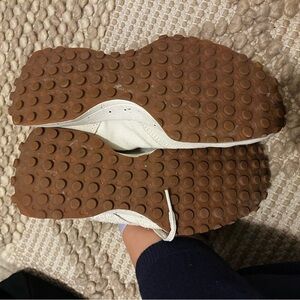 Stylish white sneakers featuring a gum sole. Perfect for casual wear.