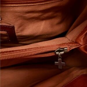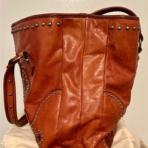 This leather tote bag is a Cripple Creek Western Tote, characterized by its distinctive leather cross overlay and silver-tone stud accents. @ Poshmark +1