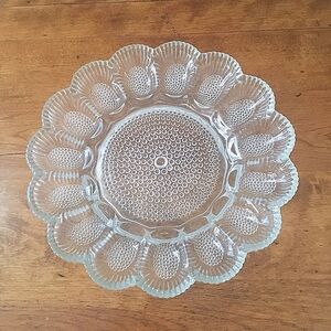This listing is for an Anchor Hocking, glass, vintage deviled egg dish. It is in perfect condition, considering age. It holds 12 eggs, has a scalloped edge with ribbed slots for each egg. The divine accoutrement as a serving dish for Easter. I have also seen this used for oysters with fresh lemon wedges in the center. It measures approximately 9 3/4" in diameter. Wonderful condition, free of chips, cracks or repairs. I have a similar deviled egg dish listed in my closet as shown in the last photo. This listing is only for the egg dish described. Buy with confidence, careful packaging promised. I love to bundle.