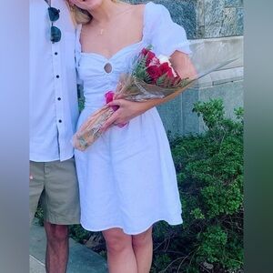 Chic white mini dress. Features puff sleeves and a front cut-out. Ideal for casual outings.