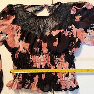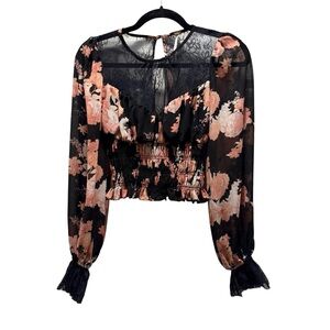 🗒️ Free People Daphne top, floral mesh top, sheer lace top, smocked waist top, boho blouse, romantic, cottagecore, feminine, date night, wedding guest, sheer sleeves, balloon sleeves, black floral, pink floral, size XS, FP Intimately, lace yoke, Victorian style, whimsical, coquette, EUC
