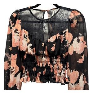 This romantic Free People top features a black base with a vibrant pink and coral floral print. It has a delicate sheer lace yoke and long sheer blouson sleeves with smocked lace cuffs. The bodice is finished with a wide smocked waistband that creates a flattering, cinched look. Includes a button-keyhole closure at the back.