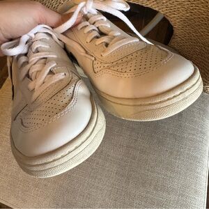 Stylish Veja sneakers. White leather with black accents. Comfortable and trendy.