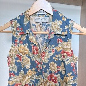 Vintage Bickett & Ingrish sleeveless button-up collared top in a timeless floral print. Crafted from a breathable linen-cotton blend (55% linen, 45% cotton), this piece is lightweight, soft, and perfect for warm weather layering. Features a classic button front, collared neckline, and tailored silhouette that can be styled casually or dressed up.