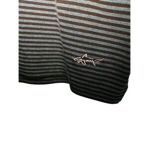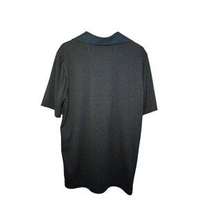 This Greg Norman Polo Shirt in size medium features a green and black striped design and a collared neckline. Made of breathable jersey fabric, it is ideal for travel, casual outings, or business wear. The shirt is easy to care for, suitable for all seasons, and has a classic preppy style. Perfect for golf and other sports activities, this button-up shirt from the Greg Norman Play Dry line offers comfort and a regular fit.