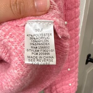 Chic pink sweater by BiBi. Features white bow patterns and pearl embellishments. Ideal for a feminine touch.