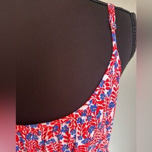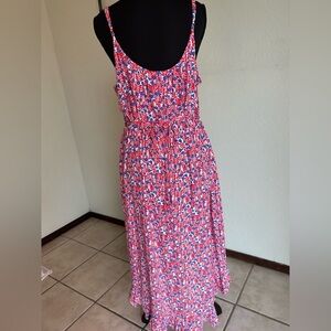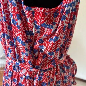 J. Crew Factory Ruffle Midi Curved Hem Dress 14 Women’s Red Blue Floral