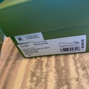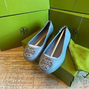 Elegant light blue flats with signature logo detail. Perfect for versatile styling.