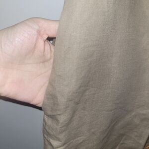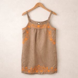 Beautiful Lucky Brand linen cotton blend embroidered tank dress in a warm neutral taupe with vibrant orange floral embroidery.