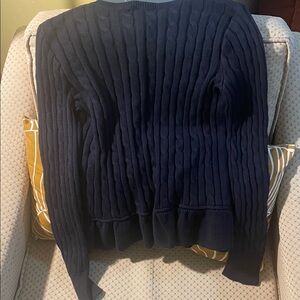 NWT Elegant dark blue cardigan with classic cable knit. Ruffle trimming at the hem. Features button-down front and signature logo in pink. Ideal for layering. 17” it to pit. 22” in length.