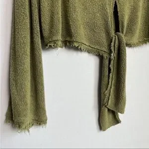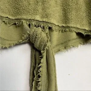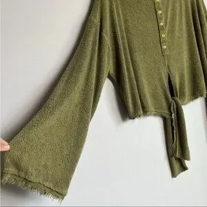 Free People Green Emma’s Henley Top Sz L Tie Waist Raw Hem LS Fairy Boho EUC