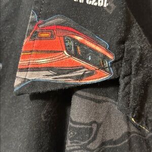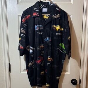 David Carey black shirt with vibrant car prints. Ideal for car lovers. See pictures tra