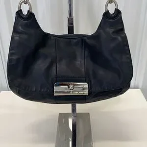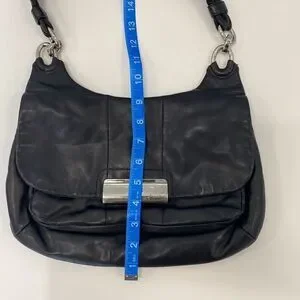Coach Kristen vintage hobo purse. The color is black in good preowned condition. Normal wear and tear dirty on the inside of the purse. See pictures for more details might have some wear to it because it is vintage still usable in good shape there’s a stain on the inside of the purse. There are scratches on the front buckle of the purse