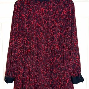 Catherines 1XWP (18/20W Petite) red and black paisley print button-front blouse with contrast black collar and cuffs. Lightweight stretch fabric with flattering flowy fit, perfect for office wear, business casual, holiday events, or evening styling. Petite length for proportioned fit. Comfortable polyester/spandex blend with subtle sheen. Gently worn and in great condition.