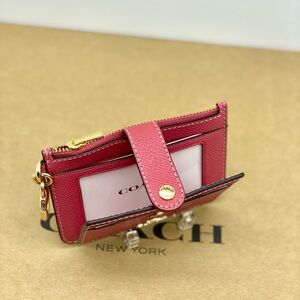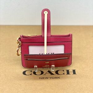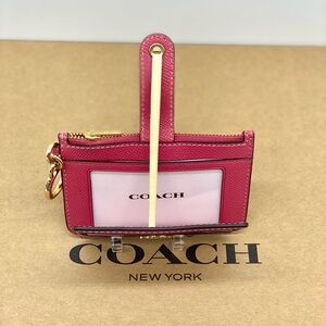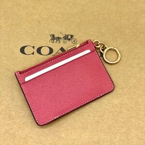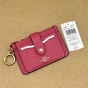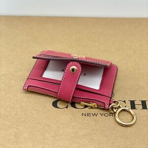 Elegant Coach card holder in rose. Features multiple slots and a convenient key ring. Perfect for daily use.