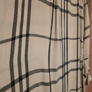 This versatile tunic-length shirt dress features a timeless black and white windowpane plaid pattern. Crafted from a soft, lightweight rayon/viscose, it offers a comfortable, relaxed fit with a partial button-down front and a classic collar. The long sleeves include functional roll-tabs, allowing for an easy transition from full-length to a casual three-quarter look, while the curved hemline makes it perfect for wearing alone as a dress or layered over leggings and boots.