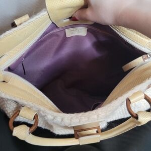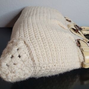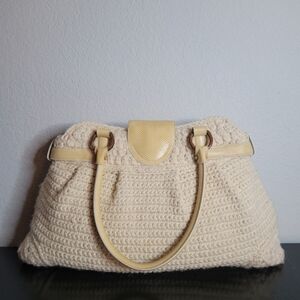 This handbag is a Salvatore Ferragamo crochet knit shoulder bag, often identified by the model name "Marisa" or "Sofia". This vintage-inspired piece is crafted from a ivory or beige wool crochet knit body and accented with dual rolled leather top handles and karung (lizard-style) trim