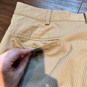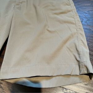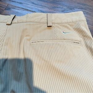 Nike golf dri fit khaki colored athletic / everyday shorts with thin white vertical pin stripes. Barely worn, in great condition! Size 34 - medium. Pockets, zipper and button fly closure. Belt loops