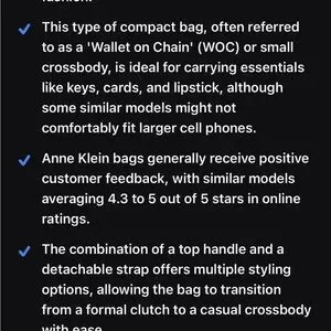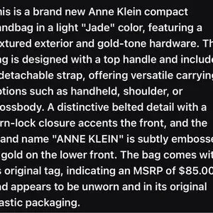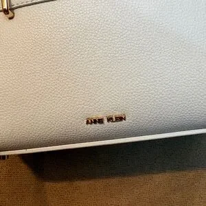 The bag is designed with a top handle and includes a detachable strap, offering versatile carrying options such as handheld, shoulder, or crossbody. A distinctive belted detail with a turn-lock closure accents the front, and the brand name "ANNE KLEIN" is subtly embossed