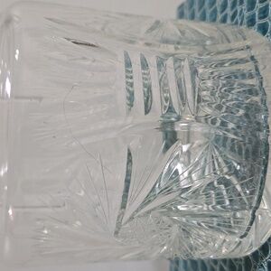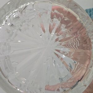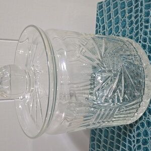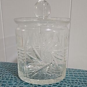 Beautiful clear crystal jar with intricate patterns. Comes with a matching lid. Perfect for candies or biscuits.