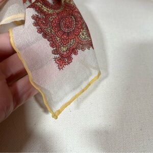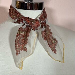 Beautiful warm colors of mustard yellow, burnt orange, rose pink and rust red on a creamy semi sheer fabric. Lovely mid century modern design of scrolling paisleys and florals with a sweet rolled edging of mustard yellow. Perfect size to wear as a neck scarf. slight crepe texture. lovely condition