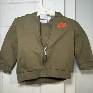 Khaki green infant hoodie with bright orange Nike logo. Includes a front zipper and hood.size 6 months