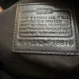 Chic Coach shoulder bag with signature pattern. Features sleek black straps and silver accents. Perfect for everyday elegance.