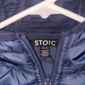 Stoic navy jacket with quilted front, hood, and full zipper closure. Zippered pockets and thumb holes for extra warmth, Great for running, hiking, or casual wear.