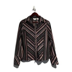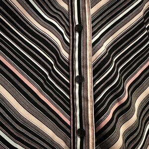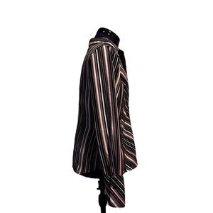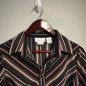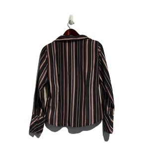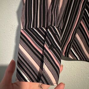 Worthington Pink Black Stripe Long Sleeve Top. Size Small. Pink black and white stripe pattern. Button front. Collared neckline. Button sleeves. Minor general wear in good condition.