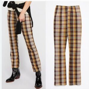 These pants are Free People Clean Crop Flare Pants. A high-rise, pull-on style pant that features a vintage-inspired plaid pattern in a rich color blend of brown, gold, chocolate and white.