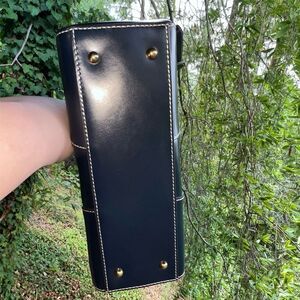 Keywords: Dooney & Bourke, leather satchel, navy bag, women's handbag, structured tote, spacious interior, matching wallet, gold hardware, casual bag, pre-owned handbag.