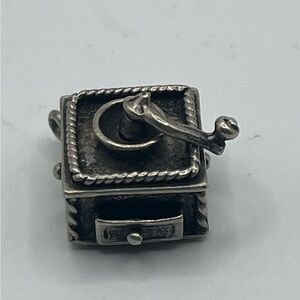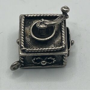 Sterling charm vintage coffee grinder. Handle on top spins.