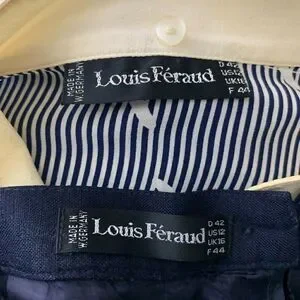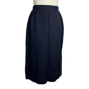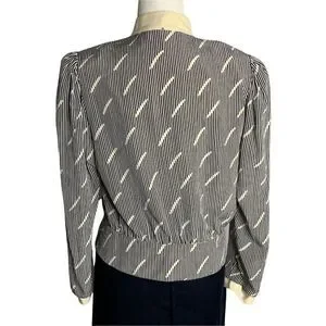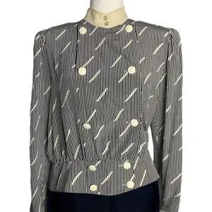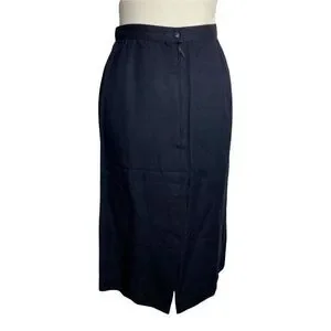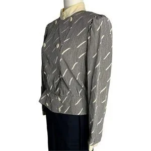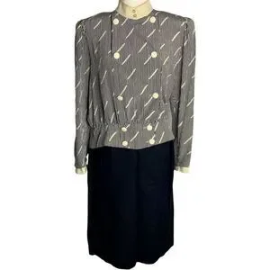 Vintage 80s Louis Feraud Top Skirt Set 12 Navy Blue Linen Silk Stripe Button Up