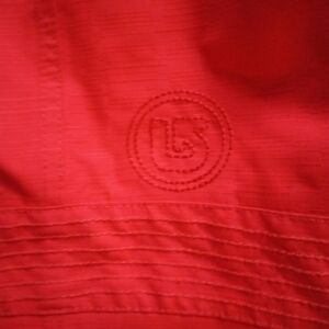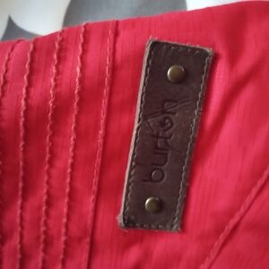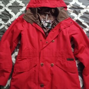 Stylish red hooded burton jacket with double-breasted design. Features unique button details and front pockets.