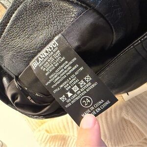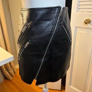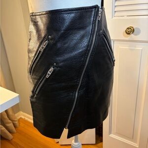 Edgy black leather mini skirt. Features asymmetrical zipper design. Ideal for a bold statement.