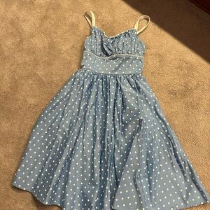 Charming blue midi dress with white polka dots. Features a fitted bodice and flared skirt. Ideal for stylish outings. Open to offers