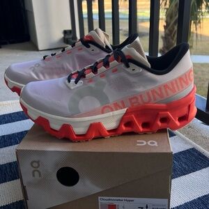 Dynamic On Running Cloudmonster shoes in vibrant red and white. Ideal for running and sports. Brand new, never worn.